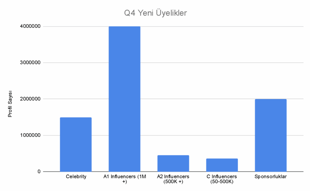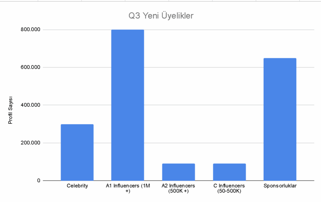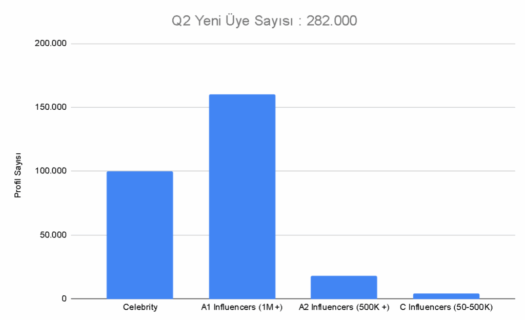 - Yeni yüksek takipçili ünlü ve influencer sayısında yüksek düşüş. Çoğu zaten üye. Platforma üye yüksek profillerden maksimum faydanın alınması için marketing ekibimiz diyalogda